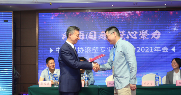 朱文玮理事长为连任专委会主任罗宏宇颁发证书。专委会副主任及理事单位先后上台领取证书。罗宏宇主任为获得滚塑创新奖和滚塑企业明星奖的安徽宁国天亿滚塑有限公司和浙江瑞堂塑料科技有限公司颁奖,并介绍秘书处组织架构。专委会史春才秘书长做《专委会2020年工作总结和2021年工作计划》的工作报告。
