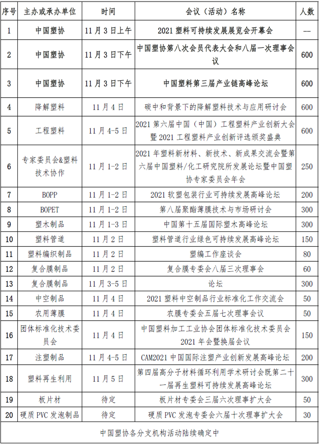 四、系列活动目不暇接,专业观众四海毕至。为丰富展会内容,增强各方交流效果,更加精准地实现对接合作,展会期间还将同期召开多场中国塑料可持续发展系列活动,其中包括以可持续发展为主题的论坛、峰会、交流会、研讨会,以分支机构工作为核心的子行业年会、理事会议,以及市场对接活动和专业培训等活动,其中,降解塑料专委会的“碳中和背景下的降解塑料技术与应用研讨会”、塑料再生利用专委会的“第四届高分子材料循环利用学术研讨会暨第二十一届再生塑料可持续发展高峰论坛”、工程塑料专委会的“2021第六届中国工程塑料产业创新大会”等盛会,将为参展商、观众带来大量新的绿色创新成果、产品、技术和市场信息。