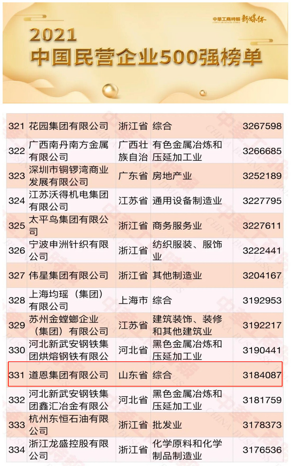 祝贺中国塑协特邀副理事长单位——道恩荣登中国民企500强331名