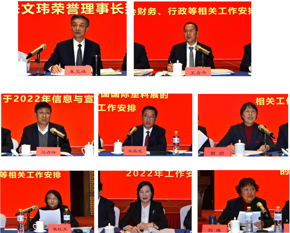 王占杰理事长、马占峰副理事长、王磊光副理事长、田岩副理事长、焦红文秘书长、刘姝副监事长分别作“关于协会财务、行政等相关工作安排”、“关于2022年信息与宣传工作的意见”、“关于2022中国国际塑料展工作的安排”、“关于科技创新及服务等相关工作安排”、“关于‘三品’战略提升及质量标准相关工作安排”、“关于会员管理 规范建设 培训的工作安排”专项报告。