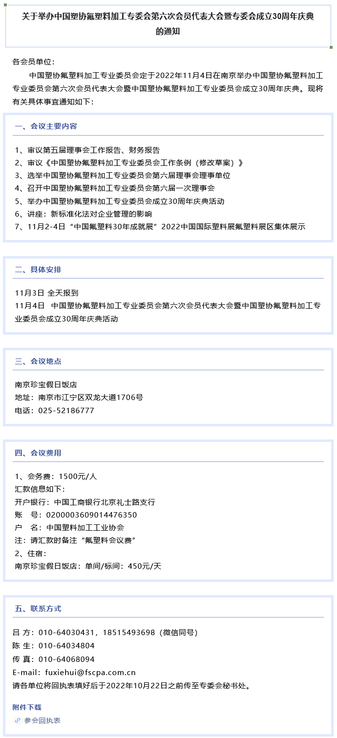 会议 | 关于举办中国塑协氟塑料加工专委会第六次会员代表大会暨专委会成立30周年庆典的通知