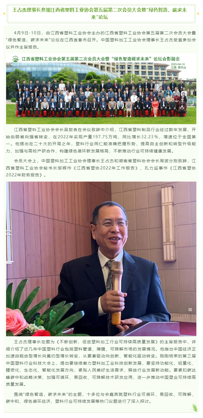 王占杰理事长参加江西省塑料工业协会第五届第二次会员大会暨“绿色智造,碳求未来”论坛