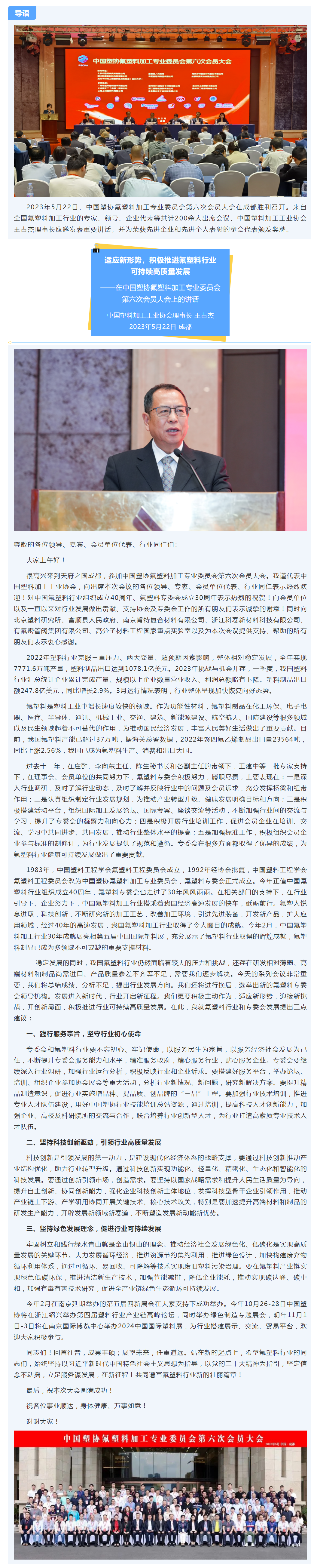 王占杰理事长在中国塑协氟塑料加工专业委员会第六次会员大会上的讲话