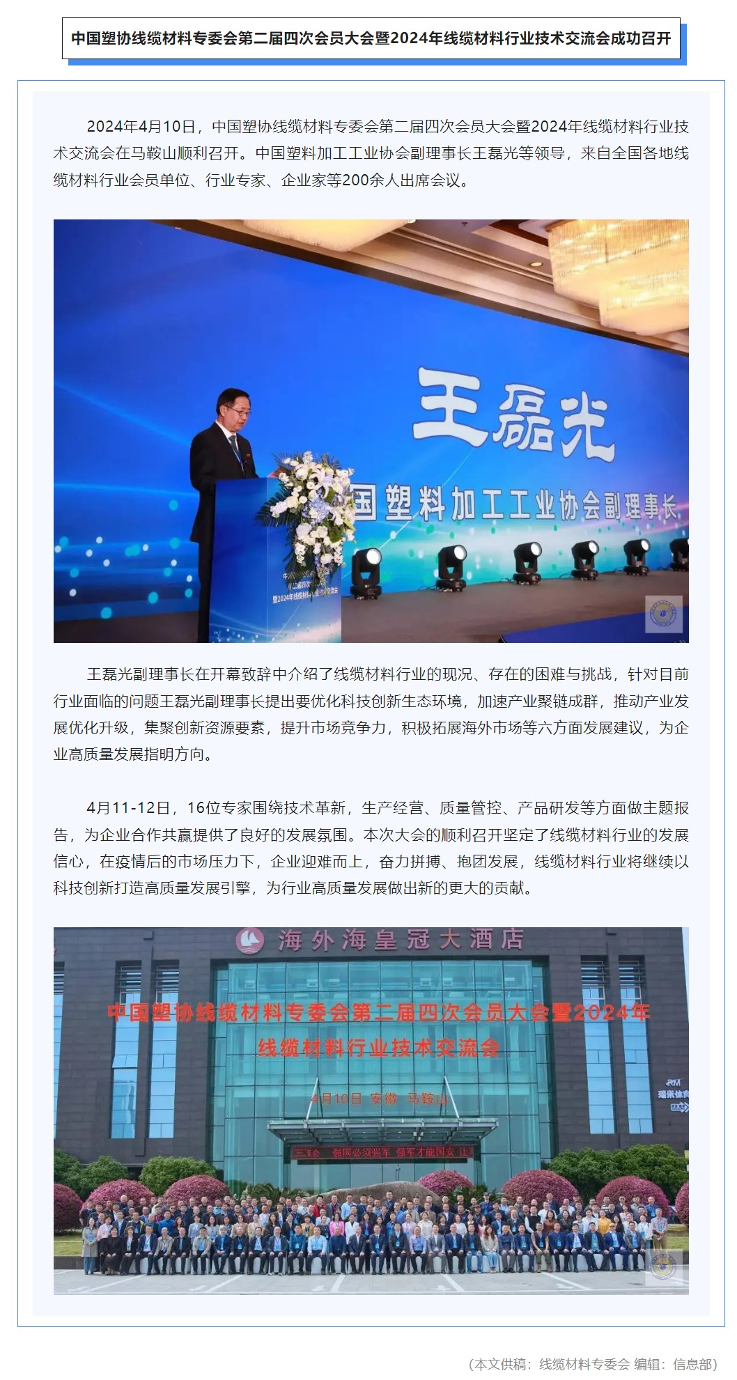 中国塑协线缆材料专委会第二届四次会员大会暨2024年线缆材料行业技术交流会成功召开