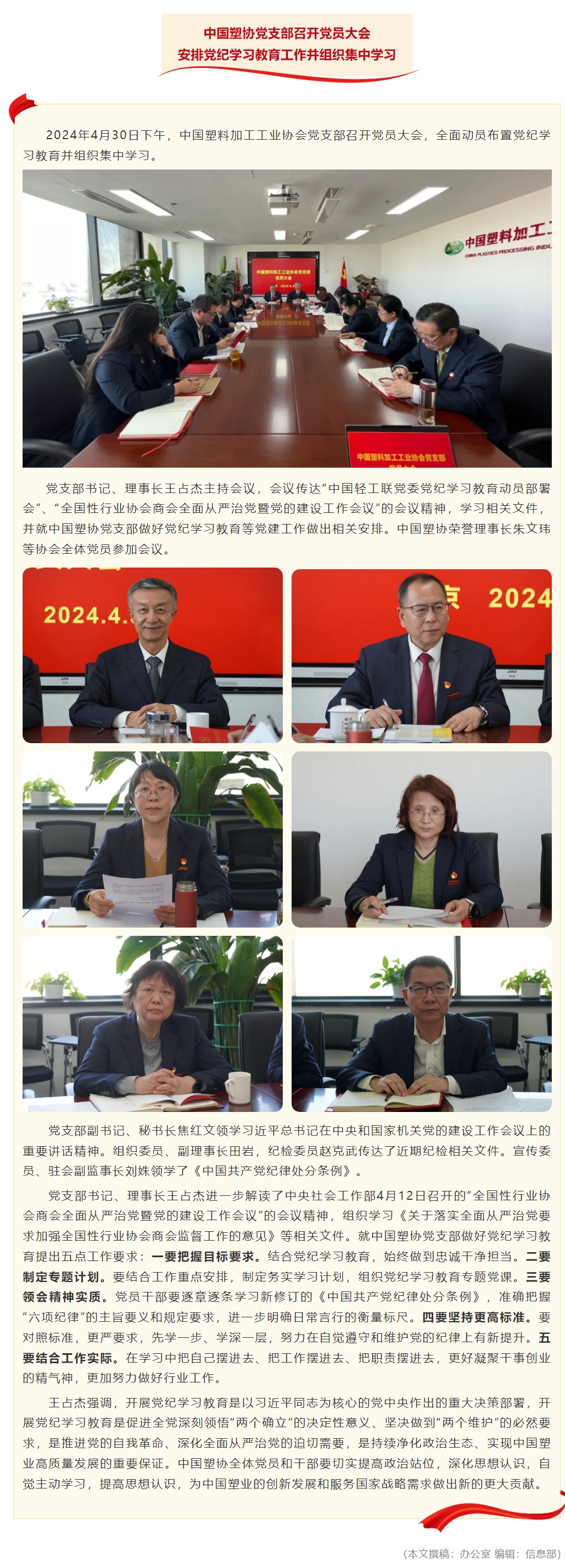 中国塑协党支部召开党员大会安排党纪学习教育工作并组织集中学习
