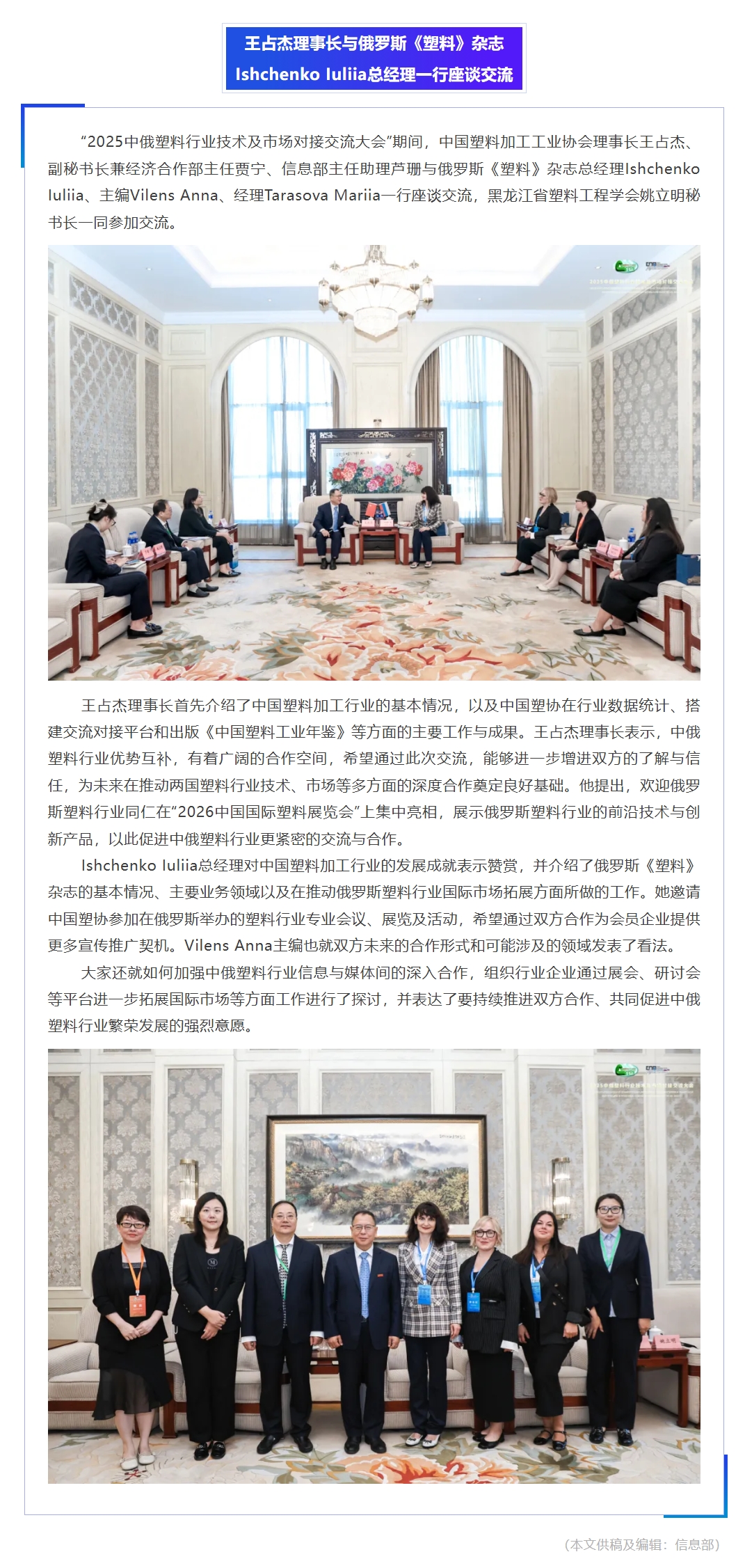 王占杰理事长与俄罗斯《塑料》杂志Ishchenko Iuliia总经理一行座谈交流