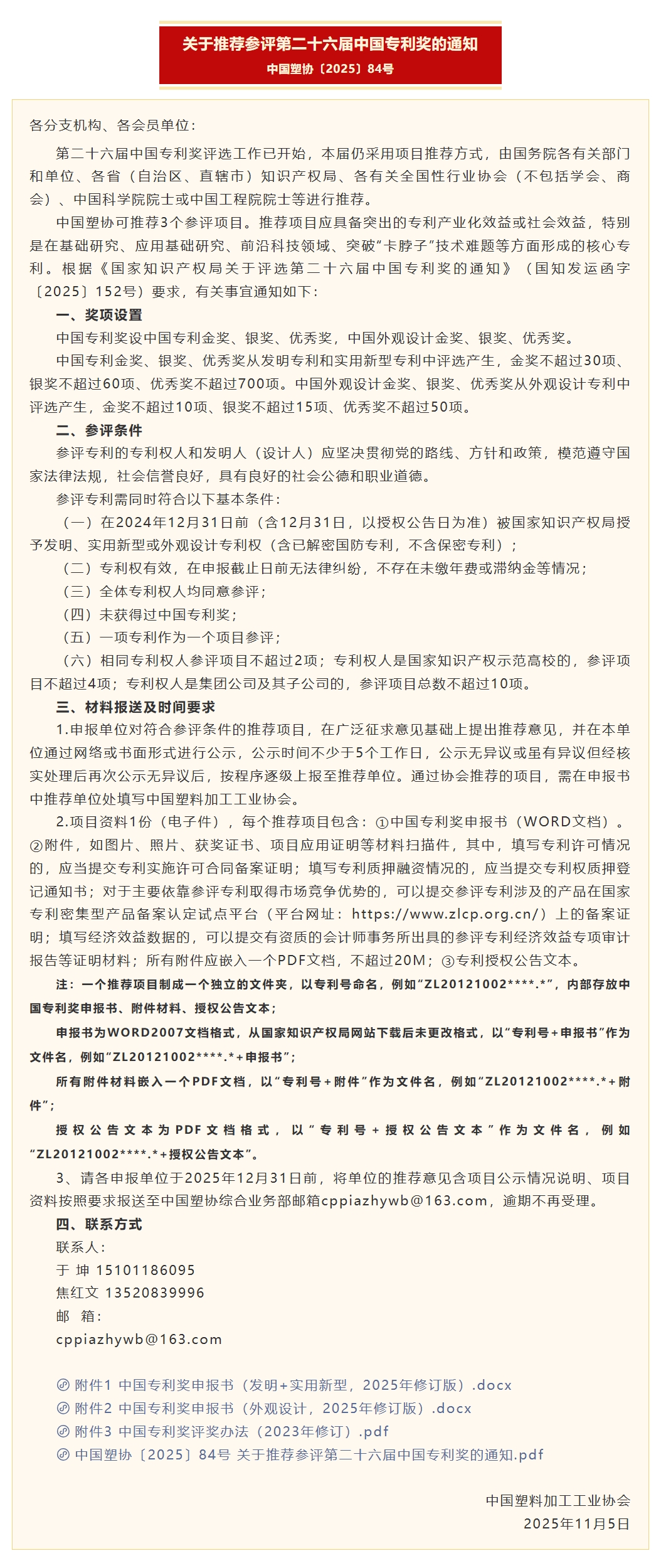 中国塑协〔2025〕84号 关于推荐参评第二十六届中国专利奖的通知.pdf