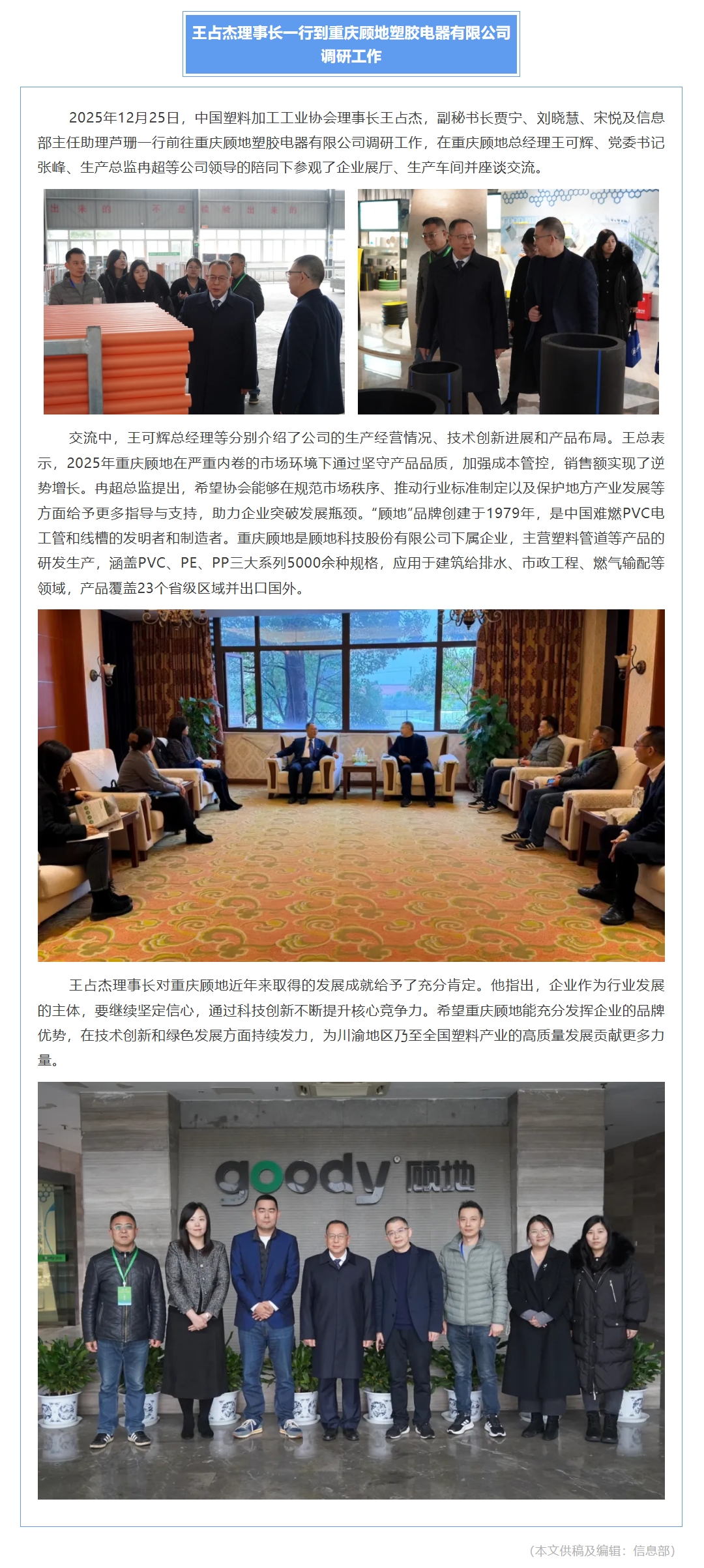 王占杰理事长一行到重庆顾地塑胶电器有限公司调研工作