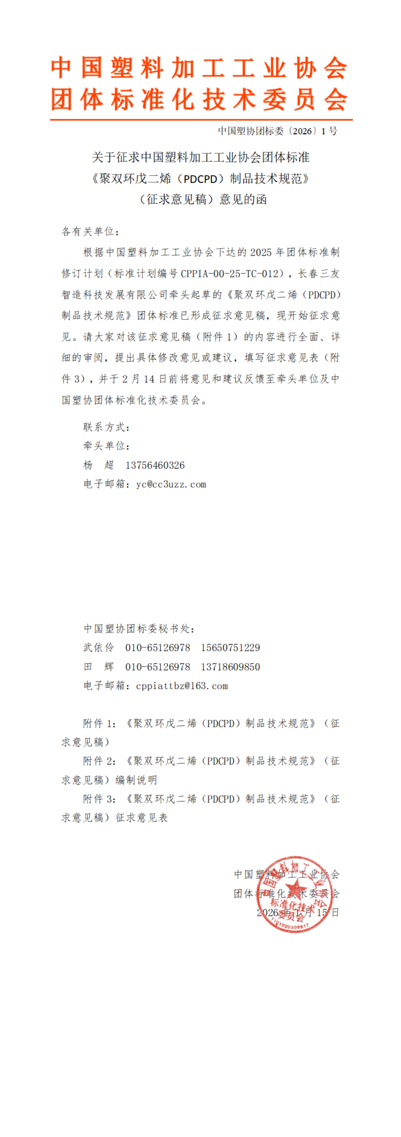 关于征求团体标准 《聚双环戊二烯(PDCPD)制品技术规范》 (征求意见稿)意见的函