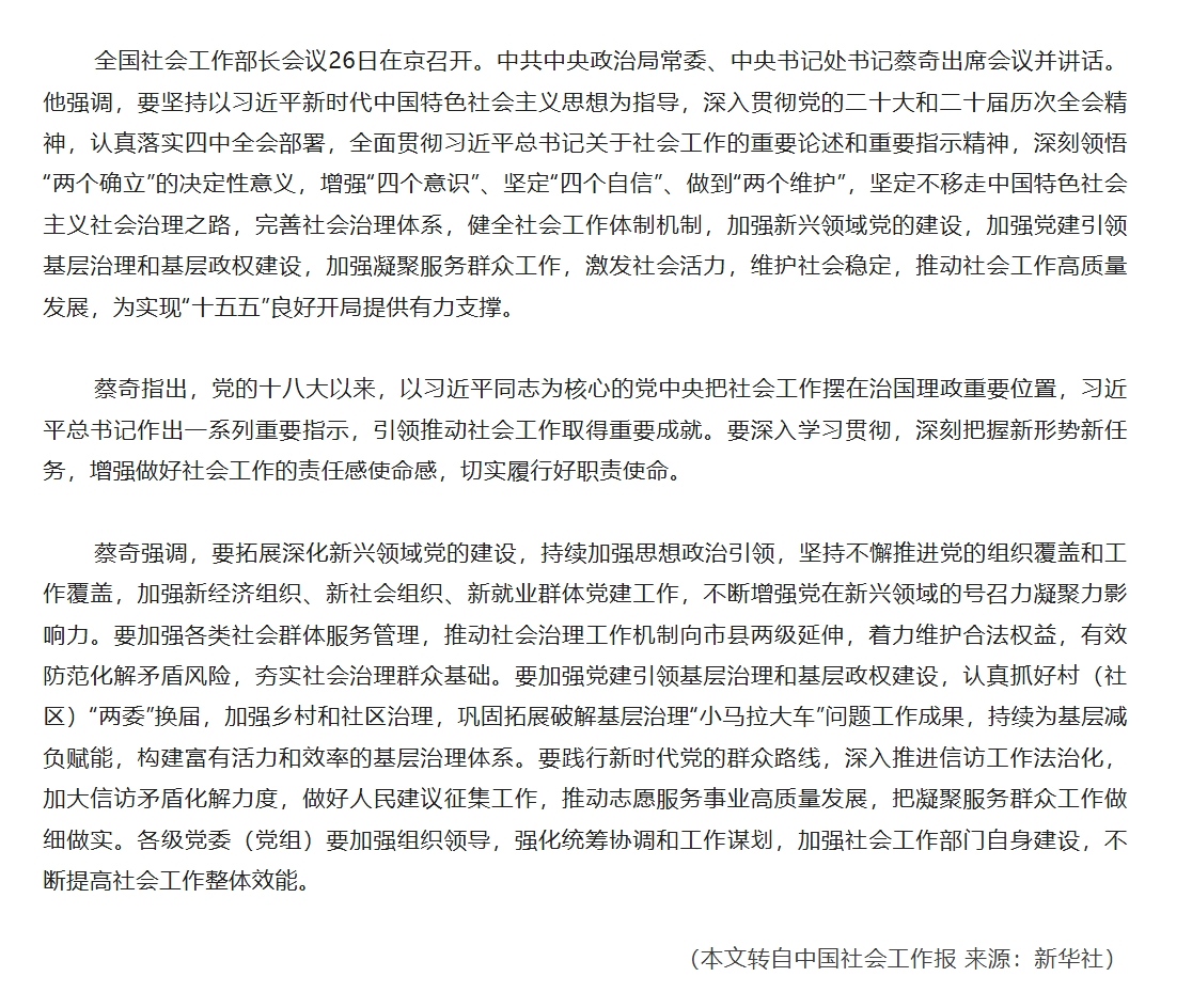 全国社会工作部长会议在京召开 蔡奇出席并讲话