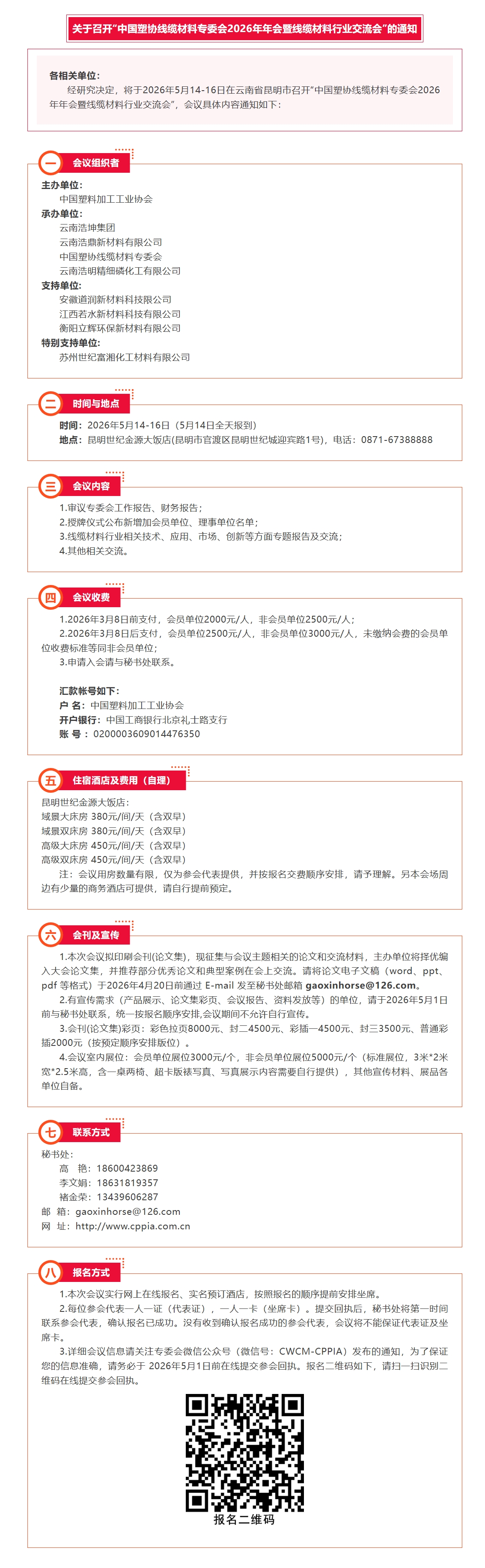 关于召开“中国塑协线缆材料专委会2026年年会暨线缆材料行业交流会”的通知