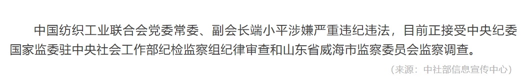 中国纺织工业联合会党委常委、副会长端小平接受纪律审查和监察调查