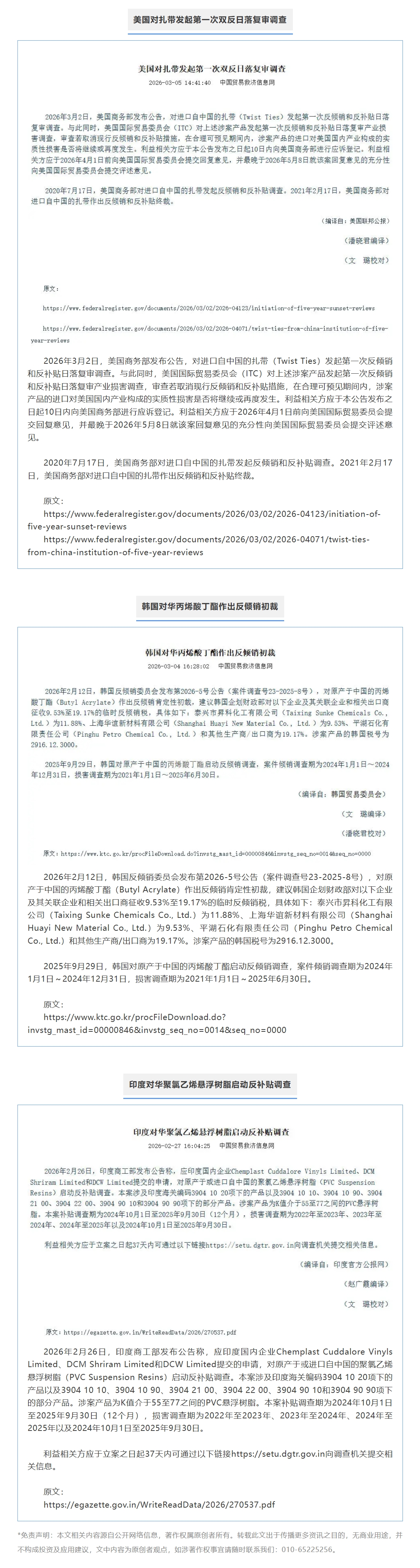 外贸预警 | 近期各国对华塑料及相关行业反倾销调查公告摘要