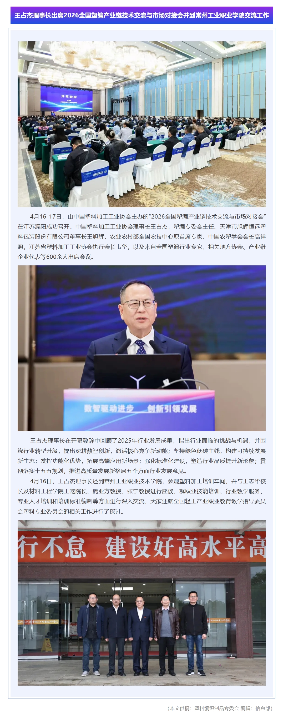 王占杰理事长出席2026全国塑编产业链技术交流与市场对接会并到常州工业职业学院交流工作